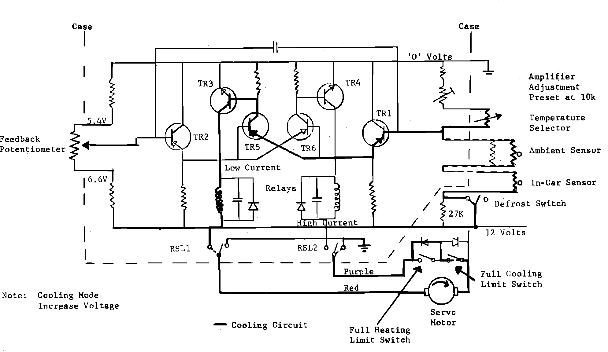 When full cooling is selected, the temperature selector is placed at 65. This introduces a resistance into the circuit which lowers the current and increases the voltage. Sensing the higher voltage, the amplifier allows the current flow through TR1, TR5 and TR3 which energizes relay RSL1 which in turn allows current flow through the red lead and return to ground through the purple lead, rotating the motor and hence the camshaft into the cooling mode. Under high ambient conditions, the Ranco thermostat is also overridden by the Ranco override switch.