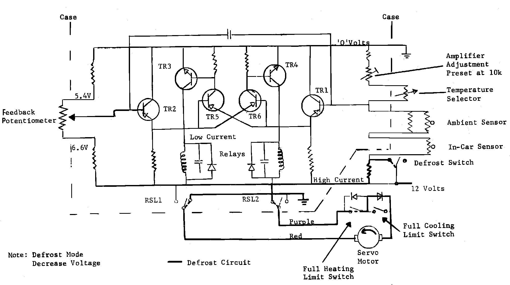 When defrost is selected, the temperature selector is placed at 85. This introduces a 27K resistance into the circuit which raises the current and reduces the voltage bypassing the amplifier bias circuit and causes the camshaft to rotate to the full heating mode. The fans will operate at the highest speed.