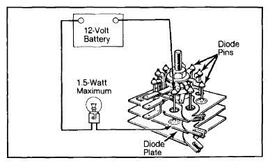 - Connect a 12-volt battery lead, with a 1.5-watt (maximum) test lamp connected in series, to a diode plate. Connect other battery lead, in turn, to each diode pin. See Fig 1. Then reverse the connections.