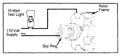 Using a 110-volt A.C. supply and a 15-watt test lamp, check for insulation between one of the slip rings and rotor frame. See Fig 1. If lamp lights, rotor is shorted.