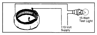 - Connect 12-volt battery and 36-watt test lamp to 2 of the stator connections. Repeat test using any other combination of 2 of the 3 connections. If lamp fails to light in either test, stator has an open coil.