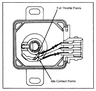 A contact type throttle switch is installed on throttle chamber. The throttle switch sends information on throttle position to ECU. On the contact switch, signals are sent when throttle is at idle or full throttle positions. See Figure.