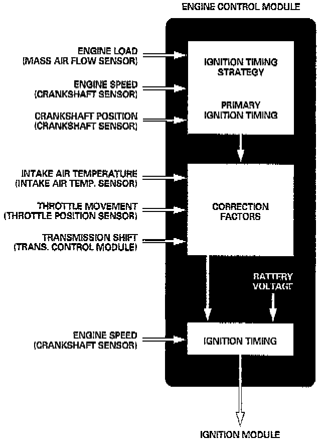 Ignition timing is controlled by the engine control module (ECM) according to sensor inputs. As with fuel injection, the sensed control inputs form two groups: primary and secondary. Primary control inputs are intake mass air flow (engine load) and engine speed; secondary control inputs consist of engine intake air temperature, throttle movement and position and transmission upshift (automatic transmission).