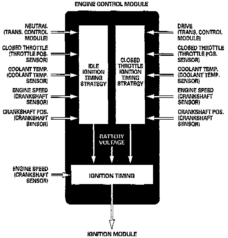 Ignition timing is controlled primarily as a function of engine load and speed. Engine load is sensed by a mass air flow sensor located in the engine air intake before the throttle housing. Engine speed is sensed by a crankshaft sensor located behind the engine damper. In addition to engine speed, the sensor supplies crankshaft position inputs to the ECM for ignition timing. The ECM processes the inputs from the mass air flow meter and the crankshaft sensor and accesses ignition timing from the ignition timing strategy. Usually, the load and speed at which the engine is running will be between load and speed sites. Two dimensional interpolation is used to calculate the correct ignition timing for the between sites engine condition.