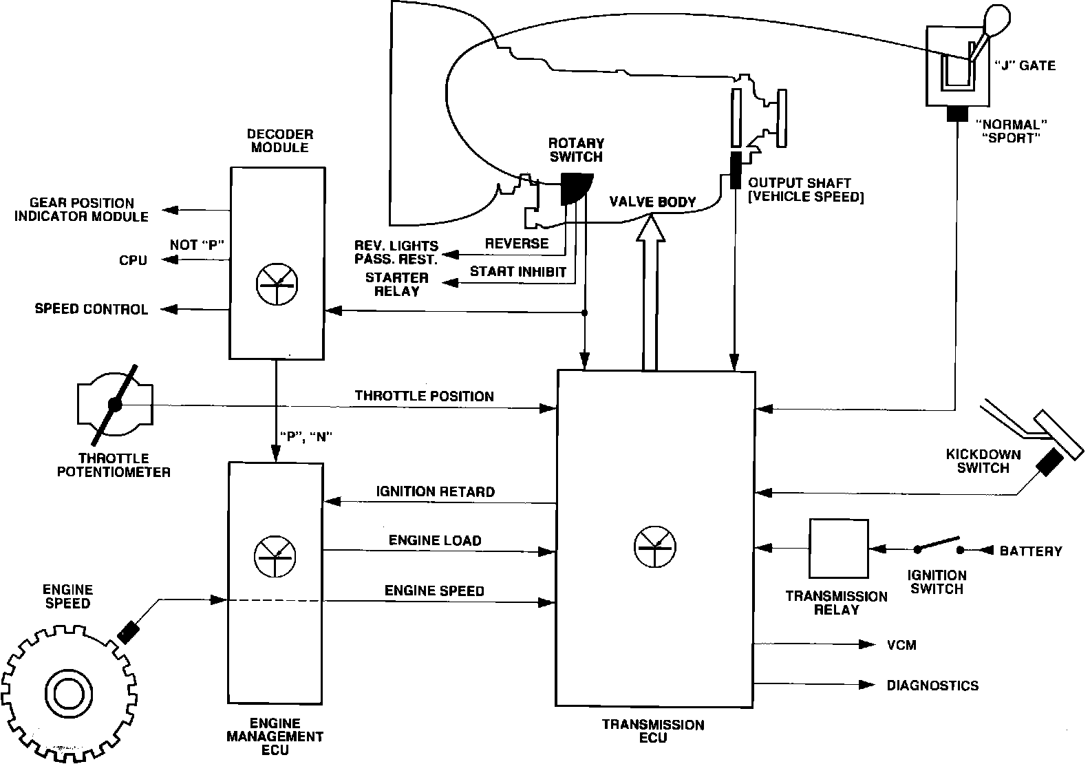 Decoder module informs the engine management ECM when either "P" or "N" is selected. The input is used by the ECM to make adjustments required to compensate for engine load changes that occur when "P" or "N" are engaged or disengaged.