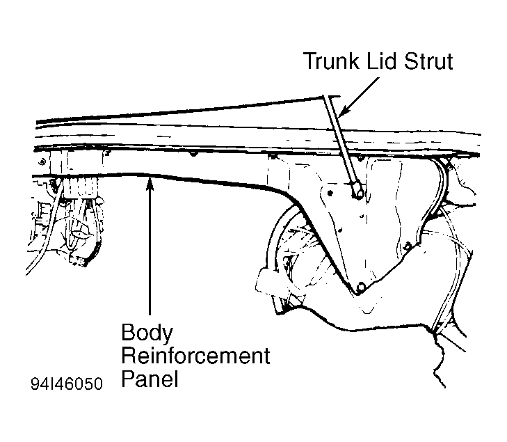 4. Install hood prop to support trunk lid. Remove lower mounting bolts from both trunk lid struts. Remove both body reinforcement panels. See Fig 1 .