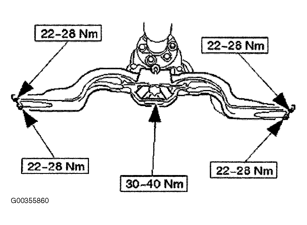 - Tighten the crossmember to body bolts and the mounting rubber to crossmember bolts to 22-28 Nm. See Figure.