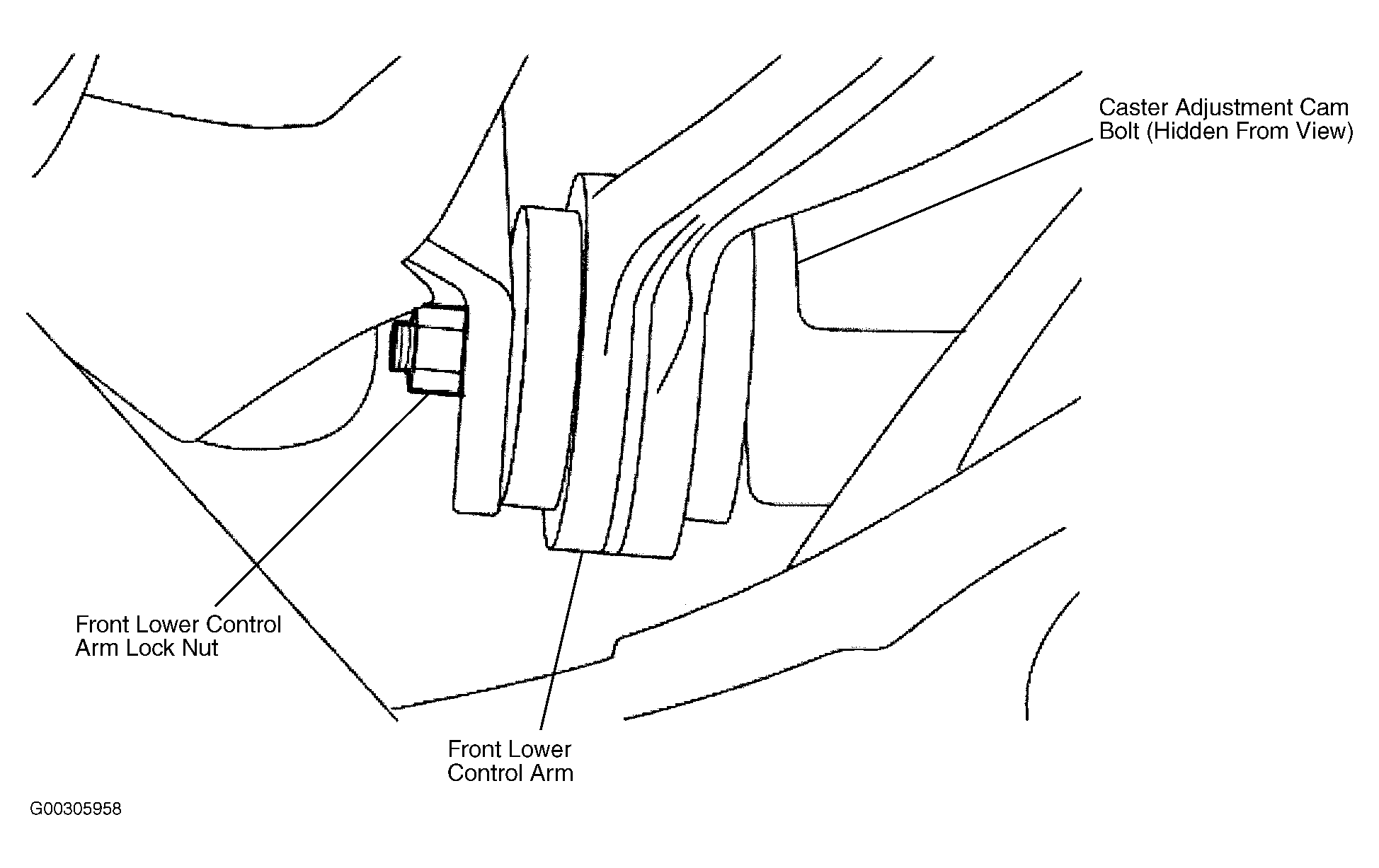 - Loosen the front lower control arm lock nut. See Fig 1 . Rotate the caster adjustment cam bolt to adjust caster.
