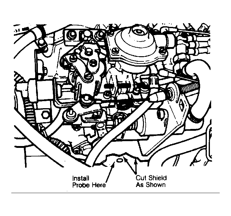- Start and warm engine to normal operating temperature. Stop engine and connect clamp of Tachometer Set (J-33300-200) to No. 1 cylinder injection pipe. Attach alligator clip to ground. Install magnetic pick-up probe into TDC access slot. See Fig 1.NOTE: To ease placement of probe in TDC access slot, it may be necessary to cut away a small portion of plastic shield underneath pump.
