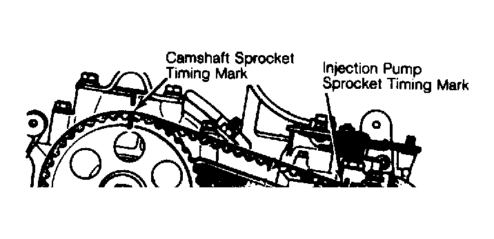 - Rotate crankshaft until No. 1 piston is at TDC position. Ensure that sprocket timing mark is aligned with center of boss on cylinder head cover, and that injection pump sprocket timing mark is aligned with center of injection pump boss. See Fig 1.