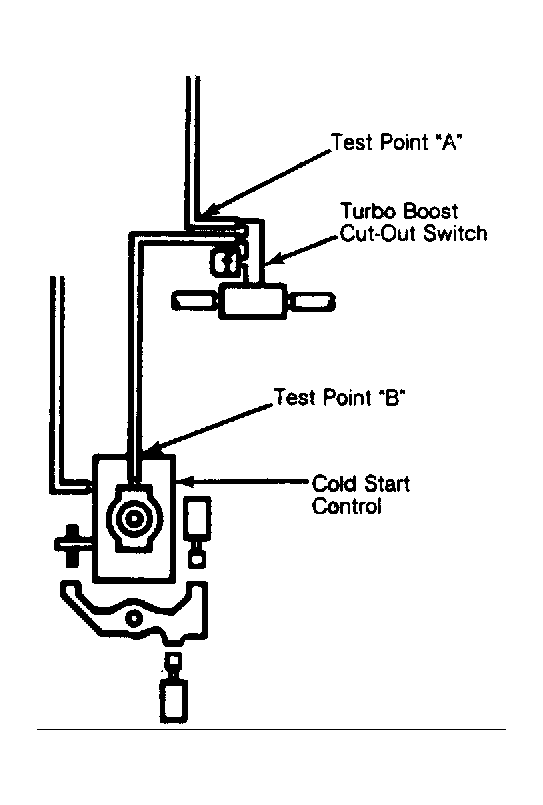 - Disconnect hose from test point "A". See Fig 1. Connect a pressure gauge to hose. Start and run engine at 3000 RPM. Record pressure reading. Disconnect gauge and reconnect hose.NOTE: If no pressure is indicated, check turbocharger operation, and for a pinched hose between manifold and turbo boost cut-out switch.