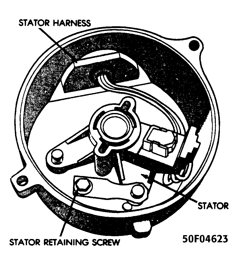 - Remove stator harness by pushing the grommet through the distributor housing. Remove stator assembly. See Fig 2 .