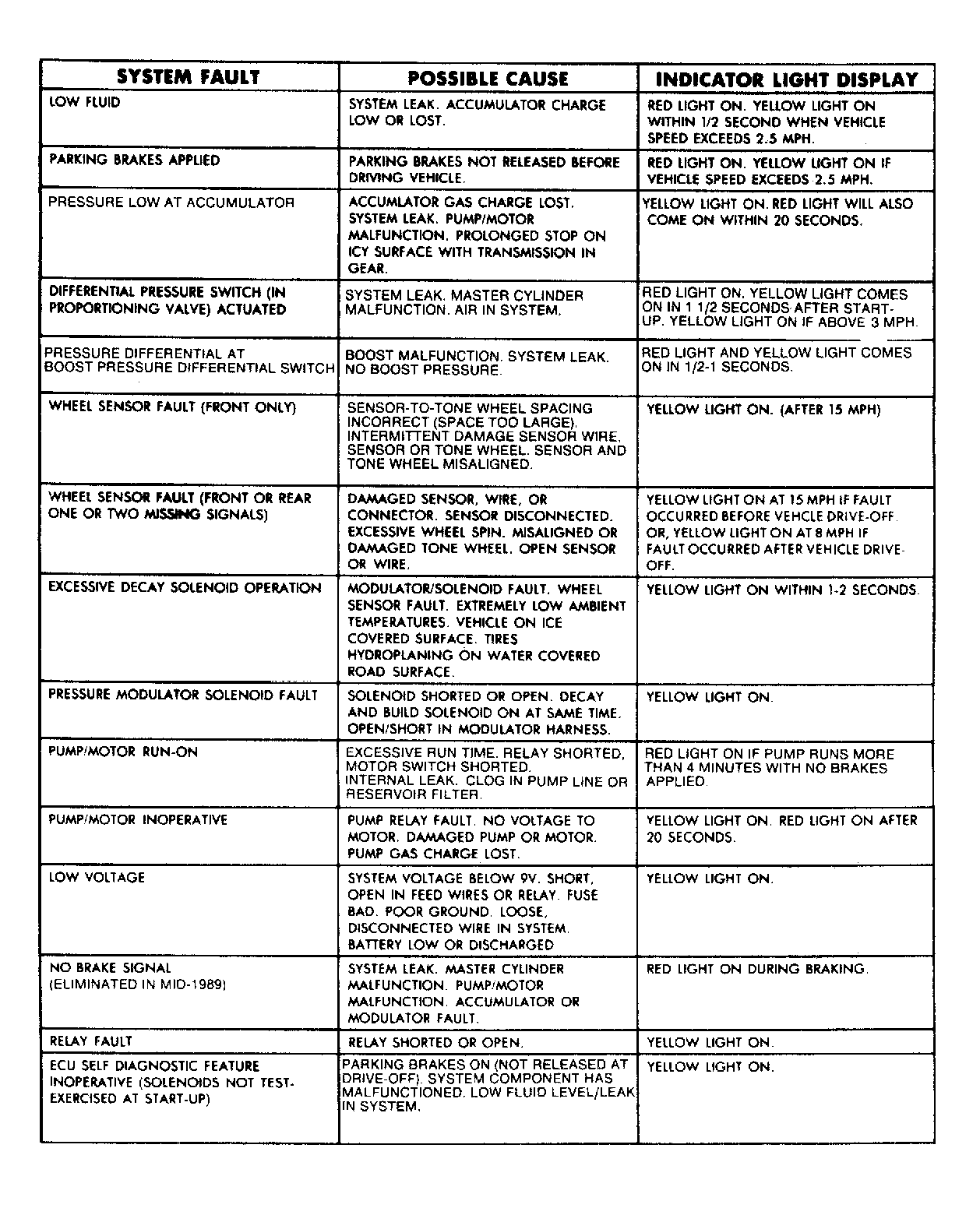 Ensure master cylinder reservoir is full, to the "V" mark on the reservoir. If reservoir is not full, check for leaks and repair (if necessary). Check all mechanical components and electrical connectors. Repair or replace any defective mechanical component. Check ABS warning lights and system operation. See Fig 1 .