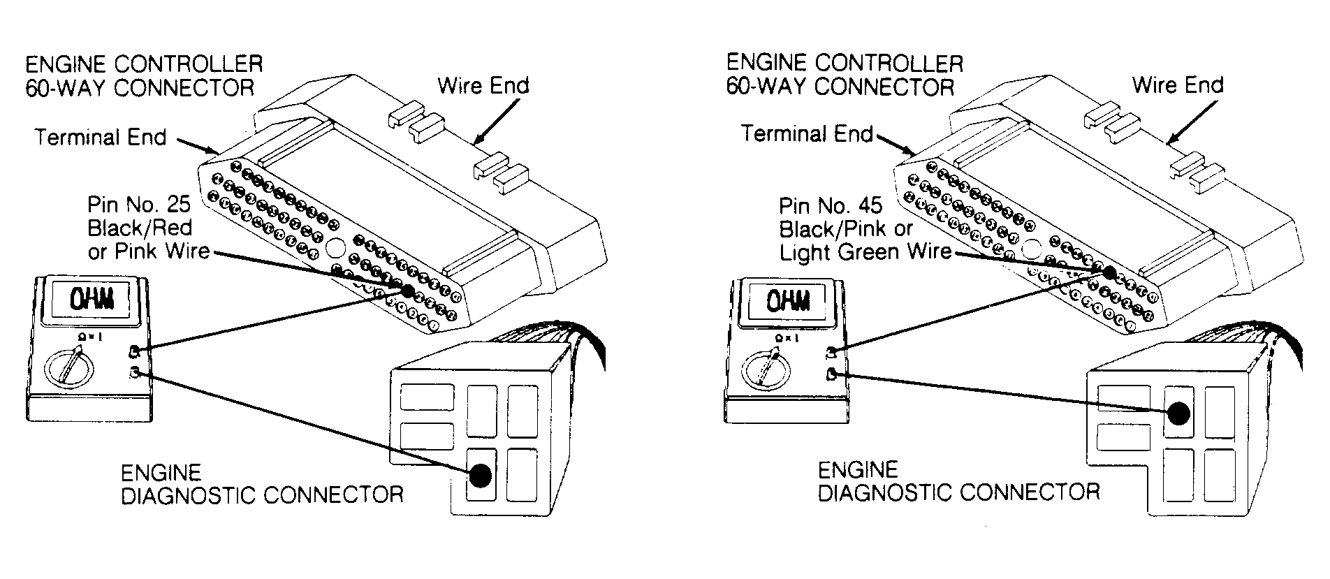 - Ensure ignition is OFF and disconnect DRB-II. Using an external ohmmeter, check resistance of Pink or Black/Red wire between SBEC-II pin No. 25 and engine diagnostic connector. See Figure . If resistance is 10 ohms or more, repair open in Pink or Black/Red wire.