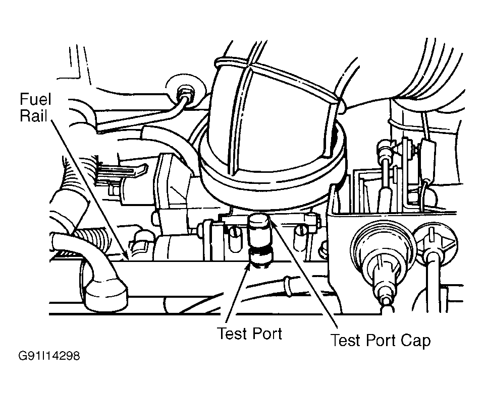 - Disconnect negative battery cable. Remove fuel filler cap. Remove cap from pressure test port on fuel rail. See Fig 1. Place shop towels around pressure test port to absorb spilled fuel.
