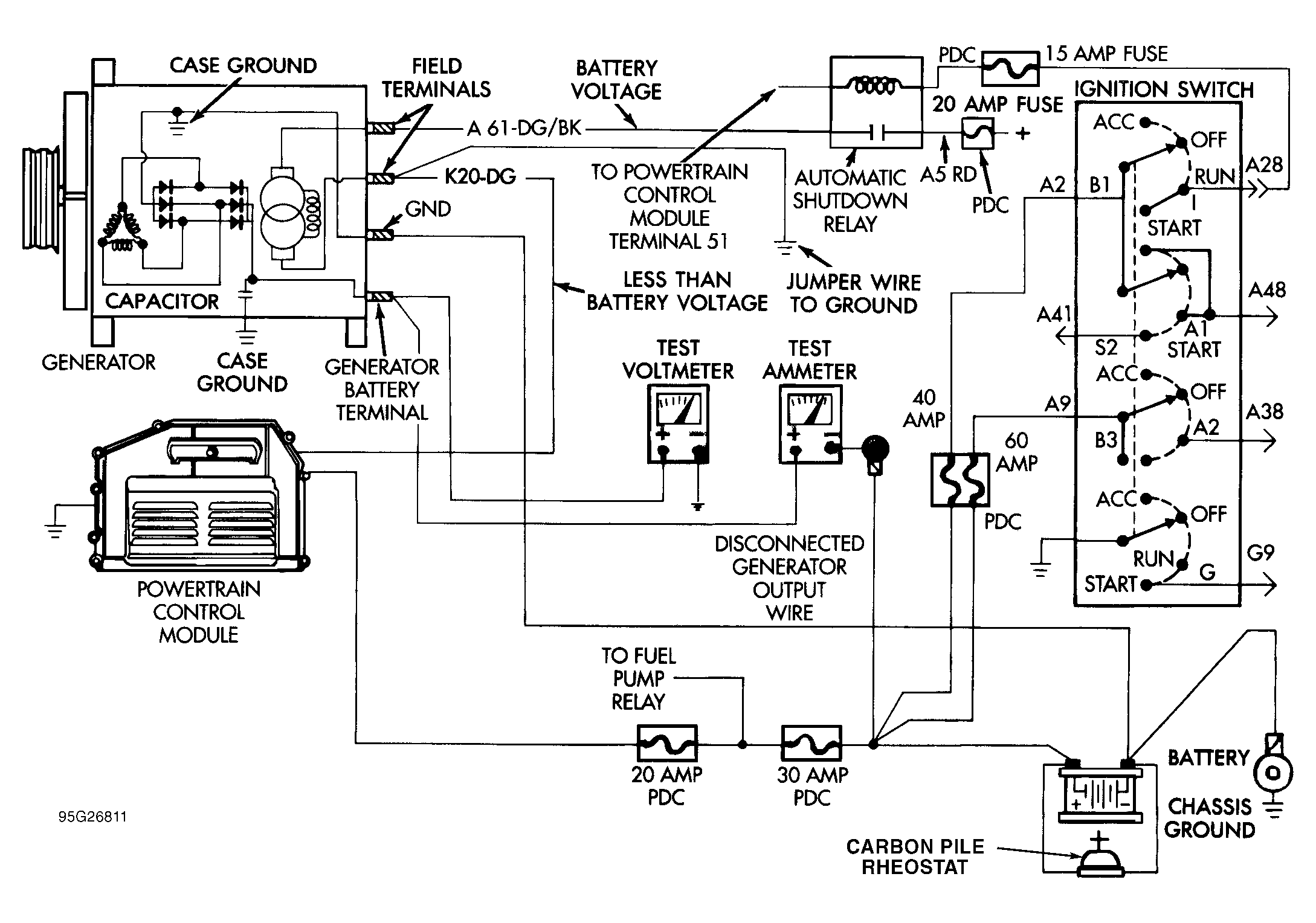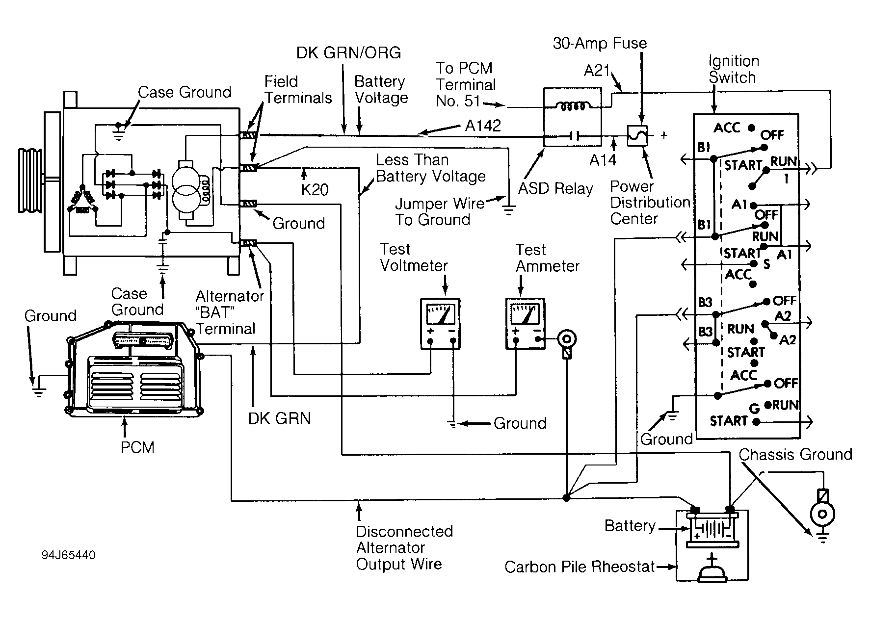 - Connect a carbon pile rheostat between battery terminals. Ensure carbon pile is in OFF position before connecting leads.CAUTION: Generator has 2 field terminals. In step 3), DO NOT connect jumper wire to generator field terminal Dark Green/Orange wire (Dark Green/Black wire on Grand Cherokee).