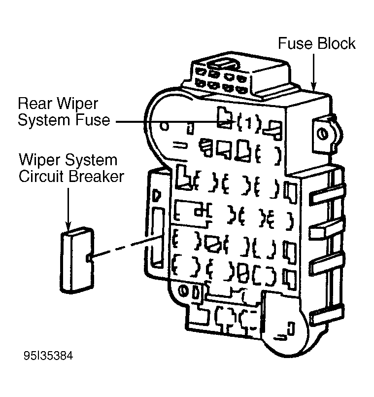 - Remove in-line wiper system circuit breaker on side of fuse block. See Fig 1 . Fuse block is mounted to left dash panel, outboard of steering column. Turn ignition switch to ACCESSORY or ON position. Using a voltmeter, check for battery voltage at battery side of circuit breaker connector (Violet/Brown wire). If battery voltage does not exist, repair open Violet/Brown wire between circuit breaker connector and ignition switch. If battery voltage exists, go to next step.
