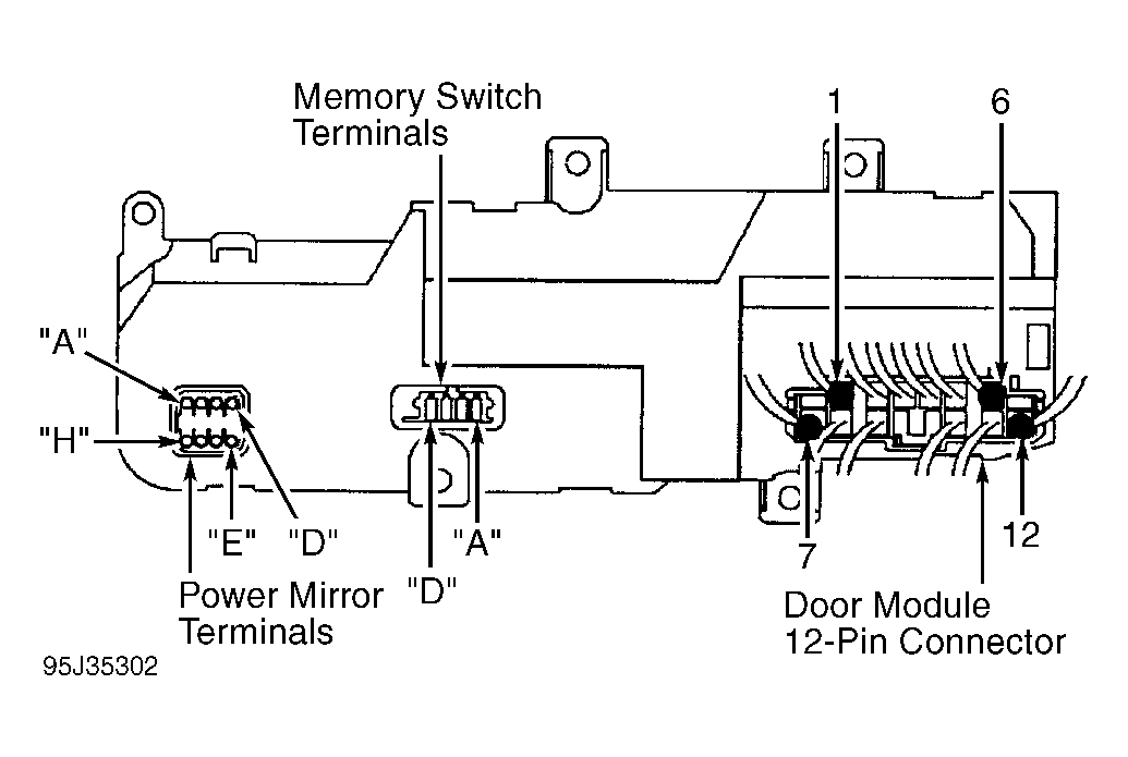- Connect a jumper wire between door module power mirror terminals "D" and "E". If scan tool displays MIRROR VERT: OPEN, replace appropriate door module. If scan tool displays MIRROR VERT: SHORT, replace appropriate mirror.