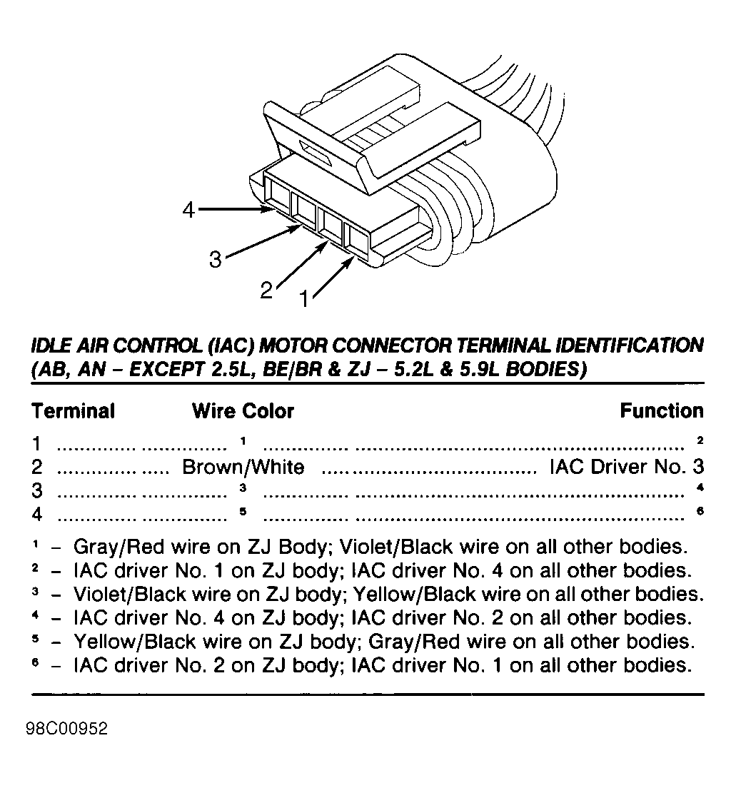 Fig 34: Identifying Idle Air Control (IAC) Motor Connector Terminals (AN - 2.5L, TJ, XJ & ZJ - 4.0L Bodies)