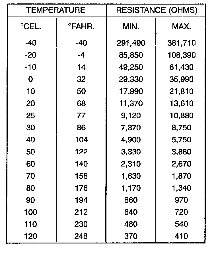 2. Test the resistance of sensor with a high input impedance (digital) volt-ohmmeter. Refer to SENSOR RESISTANCE (OHMS)-COOLANT TEMPERATURE SENSOR/INTAKE AIR TEMPERATURE SENSOR chart. The resistance (as measured across sensor terminals) should be within range shown in chart. If not, replace sensor.