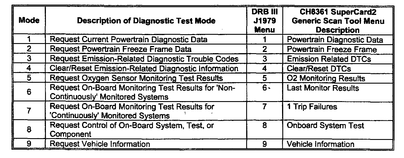 Using the DRB III(R) (ver. 52.00 and higher) and the CH8361 Supercard2 PCMCIA card (version 7.0 or higher) will provide access to Generic Scan Tool. This will provide information based on the legislative SAE J1979 Diagnostic Test Modes. These test modes are necessary to satisfy California Air Resources Board (CARB) regulations for On-Board Diagnostics - Generation II (OBD-II), and Environmental Protection Agency (EPA) requirements for Federal On-Board Diagnostics (OBO) of emission-related components and systems. The information contained in this document, was compiled and formatted by DTO's Electronic Validation DRB group to provide a baseline of our Generic Scan Tool support.