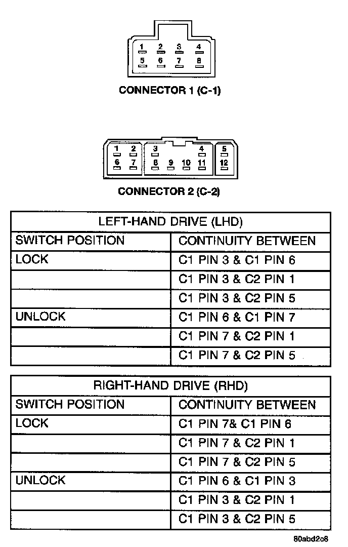 5. If the problem being diagnosed is an inoperative door lock inhibit feature or a power lock system that responds to an Unlock command, but not a Lock command, proceed as follows. Otherwise, go to Step 7. With the driver side front door closed, check for continuity between the door ajar/key in circuit cavity of the 8-way PDM wire harness connector and a good ground. There should be no continuity. If OK, go to Step 6. If not OK, repair the shorted door ajar and/or key in ignition circuits as required. Refer to Chime/Buzzer Warning Systems for more information.