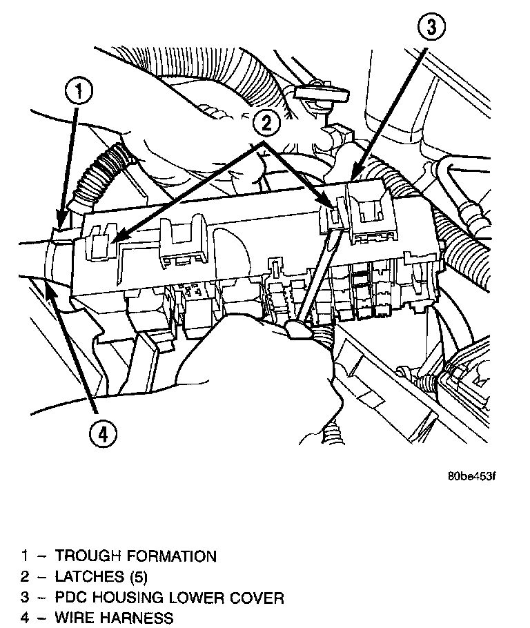 The Power Distribution Center (PDC) cover, the PDC housing lower cover, the PDC relay wedges, the PDC relay cassettes and the PDC B(+) terminal stud module are available for service replacement. The PDC cover can be simply unlatched and removed from the PDC housing without the PDC being removed or disassembled. Service of the remaining PDC components requires that the PDC be removed from its mounting and disassembled.