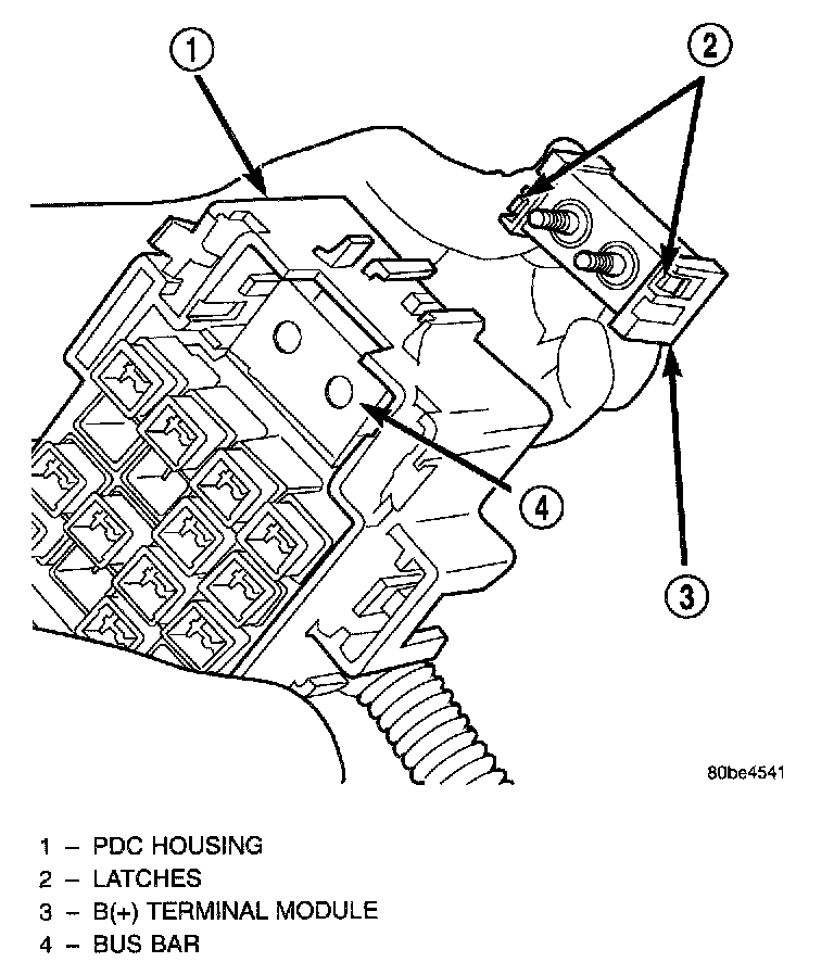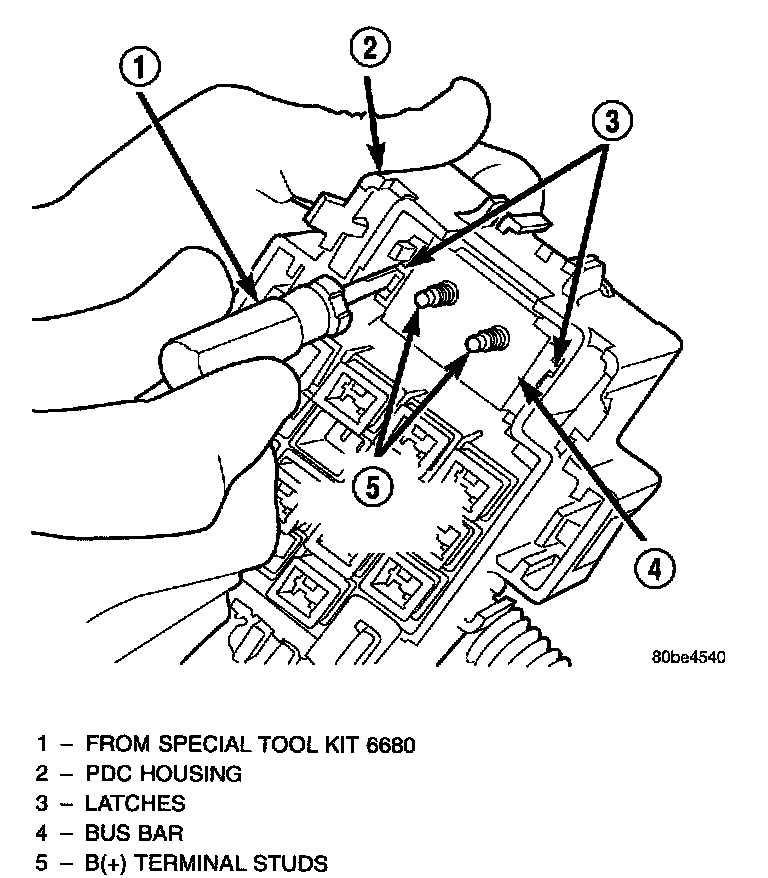 2. From the top of the PDC housing, use a small screwdriver or a terminal pick tool (Special Tool Kit 6680) to release the two latches that secure the B(+) terminal module in the PDC.