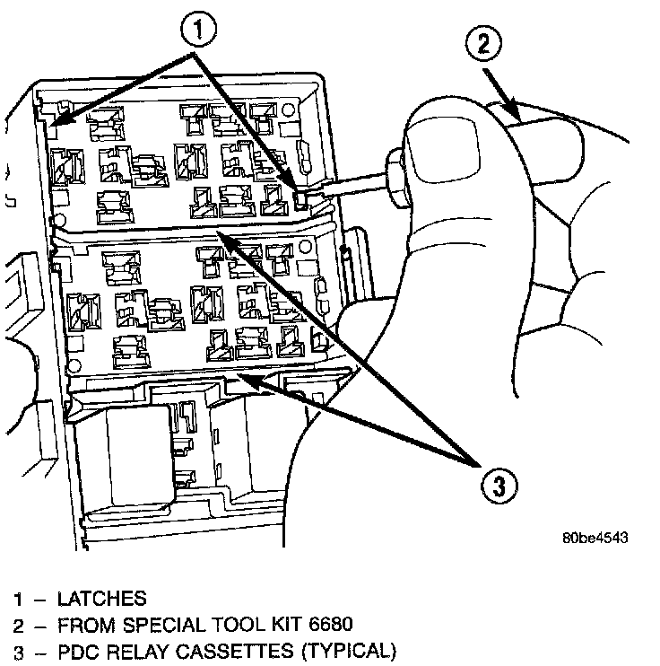 2. From the top of the PDC housing, use a small screwdriver or a terminal pick tool (Special Tool Kit 6680) to release the two latches that secure the relay cassette in the PDC.