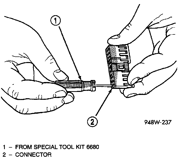 4. Position the connector locking finger away from the terminal using the proper pick from special tool kit 6680. Pull on the wire to remove the terminal from the connector.
