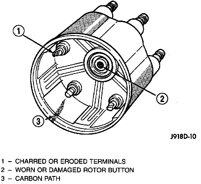 Remove the distributor cap and wipe it clean with a dry lint free cloth. Visually inspect the cap for cracks, carbon paths, broken towers or damaged rotor button. Also check for white deposits on the inside (caused by condensation entering the cap through cracks). Replace any cap that displays charred or eroded terminals. The machined surface of a terminal end (faces toward rotor) will indicate some evidence of erosion from normal operation. Examine the terminal ends for evidence of mechanical interference with the rotor tip.
