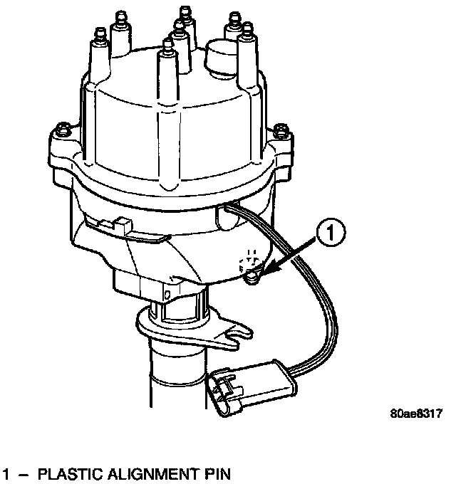 Factory replacement distributors are equipped with a plastic alignment pin already installed. The pin is located in an access hole on the bottom of the distributor housing. It is used to temporarily lock the rotor to the cylinder number 1 position during installation. The pin must be removed after installing the distributor.