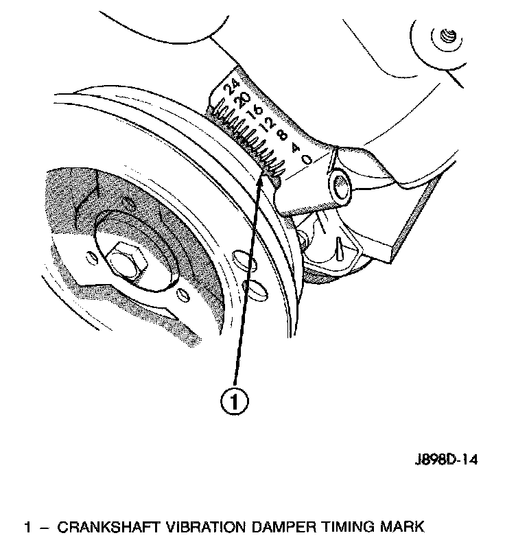 7. Slowly continue to rotate engine. Do this until timing index mark on vibration damper pulley aligns with Top Dead Center (TDC) mark (0 degree) on timing degree scale. Always rotate engine in direction of normal rotation. Do not rotate engine backward to align timing marks.