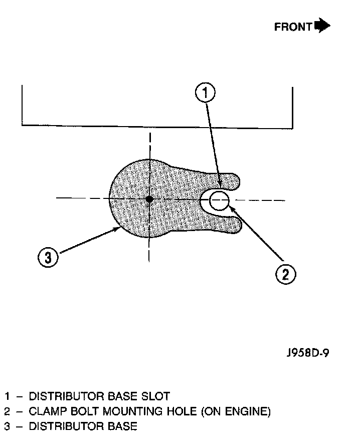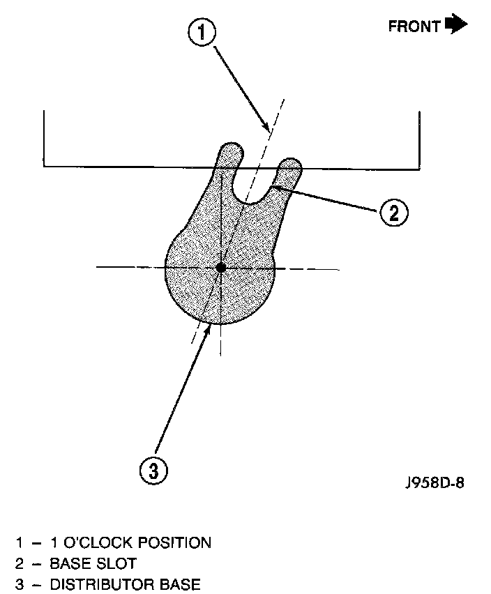 - centerline of slot at base of distributor is aligned to centerline of distributor holddown bolt hole on engine. In this position, the holddown bolt should easily pass through slot and into engine.