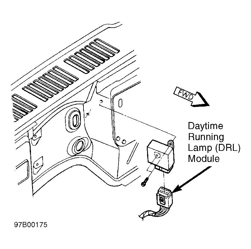 | Daytime Running Lamp (DRL) Module | In rear of engine compartment, on firewall. See Figure . |