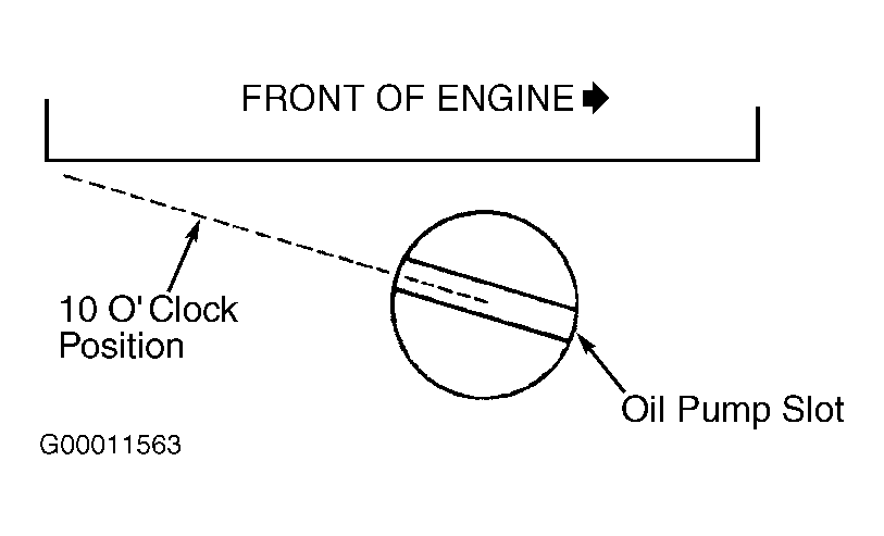 - Remove cylinder No. 1 spark plug. Rotate engine (in direction of normal rotation) until pressure is felt in cylinder No. 1. Slowly continue to rotate engine until timing mark aligns with Top Dead Center (TDC) (zero degrees) on timing scale. Check position of oil pump slot on oil pump gear. Oil pump slot should be positioned just before (counterclockwise) of 10 o'clock. See Fig 1 . If oil pump slot is not positioned properly, use a flat-blade screwdriver to adjust position.