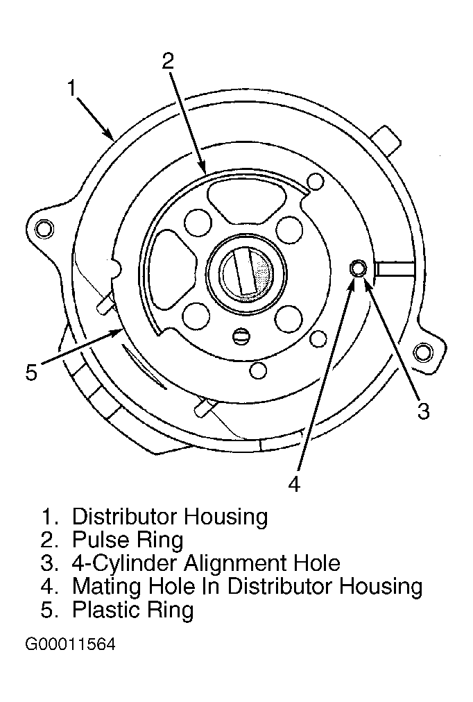 to identify proper alignment hole. Insert a pin punch or like tool through distributor housing and plastic ring. This will prevent distributor shaft from rotating. Go to next step.NOTE: During distributor installation it may be necessary to rotate rotor and distributor shaft slightly to engage distributor with slot in oil pump gear.