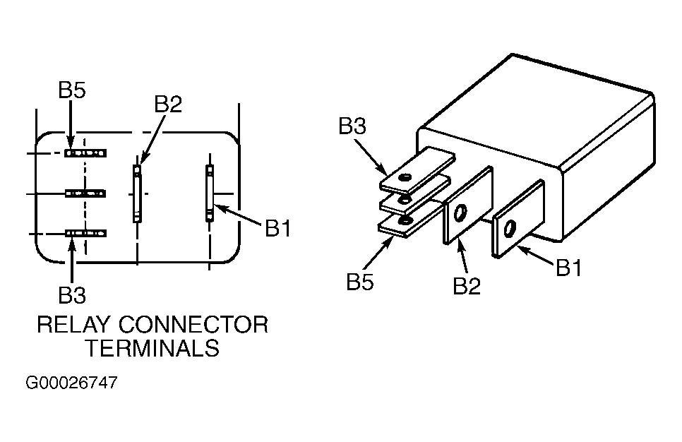 - Remove starter relay from Power Distribution Center (PDC). PDC is located in engine compartment. Refer to PDC label for starter relay identification. Using DVOM, check for continuity between starter relay terminals B1 and B2. See Figure. If no continuity exists, replace starter relay. If no continuity exists, go to next step.