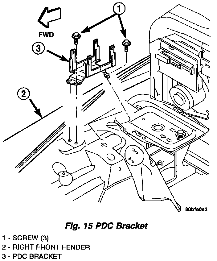3. Remove the three screws that secure the PDC bracket to the right front inner fender (Fig. 15).