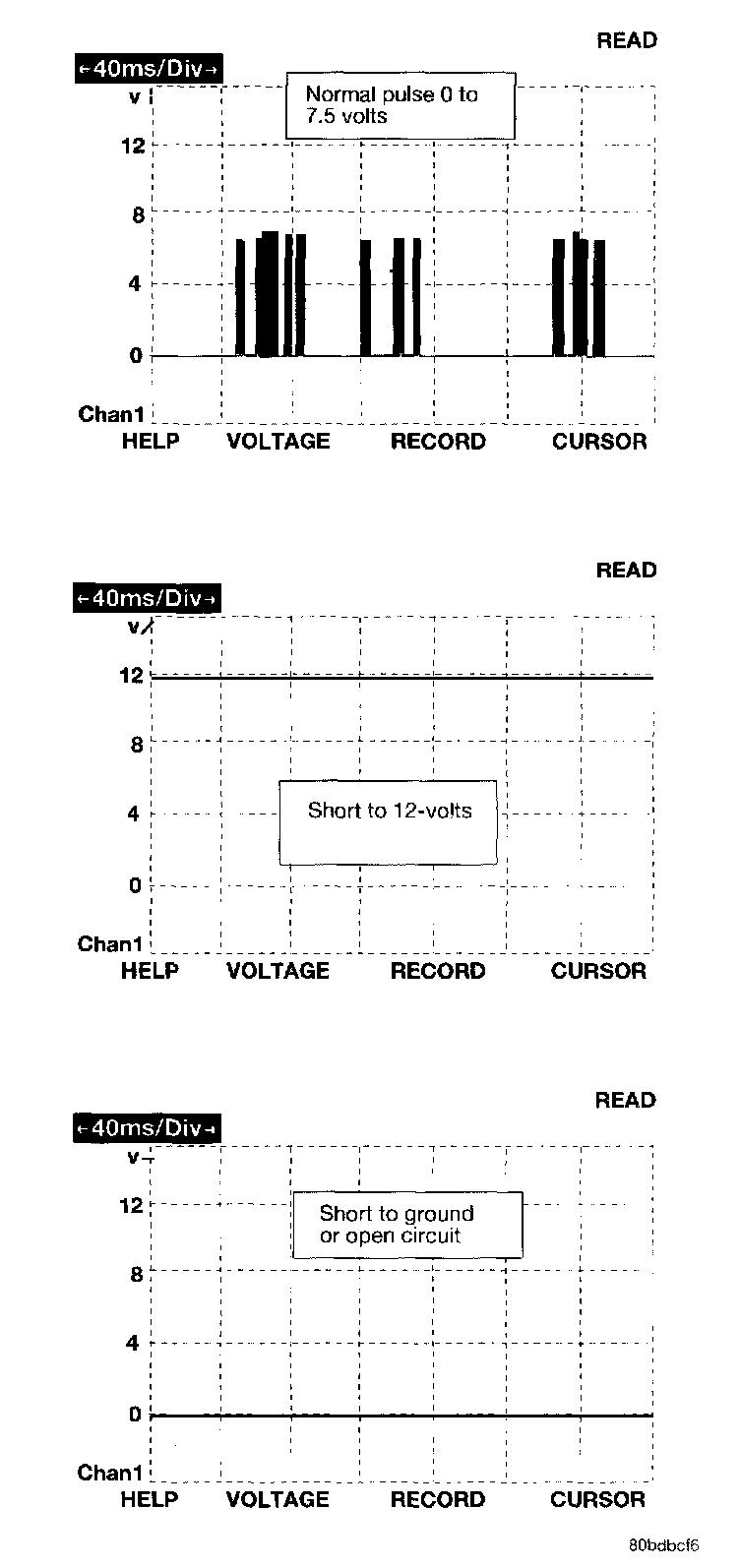 The bus messages are transmitted at a rate averaging 10800 bits per second. Since there is only voltage present when the modules transmit and the message length is only about 500 milliseconds, it is ineffective to try and measure the bus activity with a conventional voltmeter. The preferred method is to use the DRB III lab scope. The 12v square wave selection on the 20-volt scale provides a good view of the bus activity. Voltage on the bus should pulse between zero and about seven and a half volts. Refer to the following figure for some typical displays.
