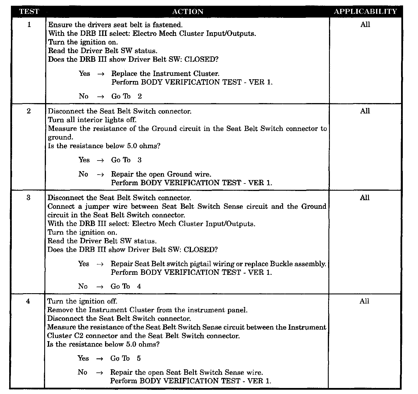 Home >> Jeep >> 2001 >> Wrangler L4-2.5L VIN P >> Repair and Diagnosis >> Powertrain Management >> Computers and Control Systems >> Relays and Modules - Computers and Control Systems >> Body Control Module >> Testing and Inspection >> Symptom Related Diagnostic Procedures >> Chime Sounds With Driver Seat Belt Fastened