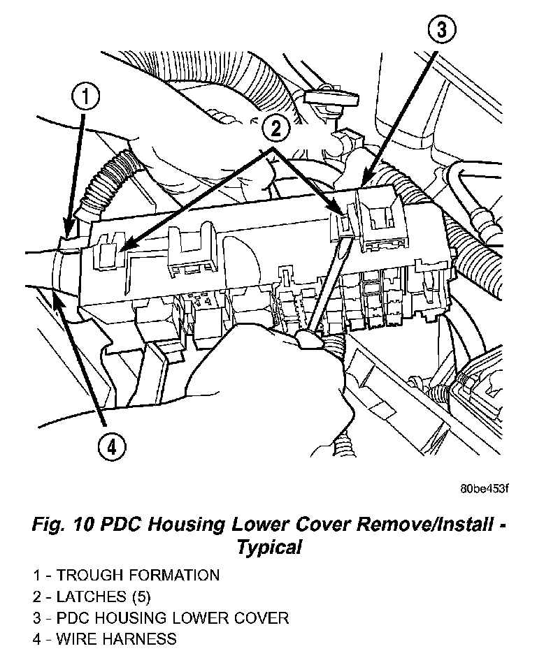 6. Where the right headlamp and dash wire harness exits the PDC, remove the tape that secures the wire harness to the trough formation on the PDC housing lower cover.