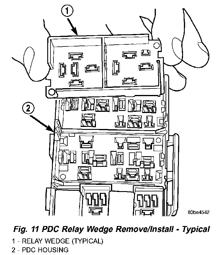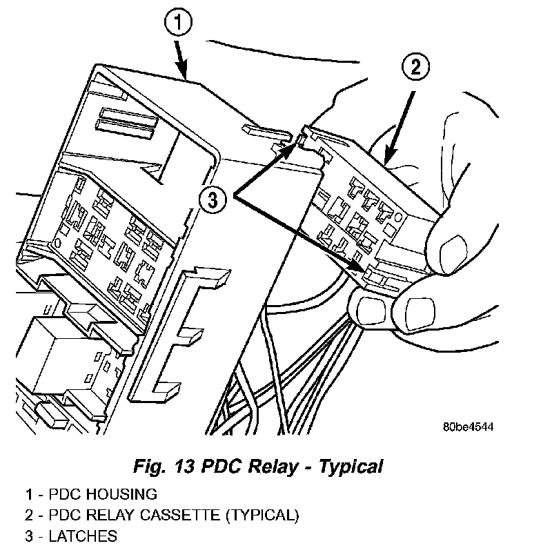CAUTION: Proper care must be taken to be certain that the wiring and terminals from the faulty PDC relay cassette are installed in the correct terminal cavities of the replacement relay cassette. To prevent mistakes it is recommended that the wiring and terminals be removed from the faulty relay cassette one cavity at a time, repaired or spliced as necessary, then installed securely into the correct cavity of the replacement relay cassette. If you are not absolutely certain into which cavity a terminal should be installed, refer to Power Distribution in the index for the location of complete circuit diagrams covering the PDC.
