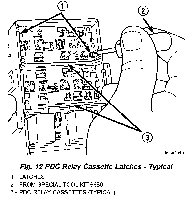 2. From the top of the PDC housing, use a small screwdriver or a terminal pick tool (Special Tool Kit 6680) to release the two latches that secure the relay cassette in the PDC (Fig. 12).
