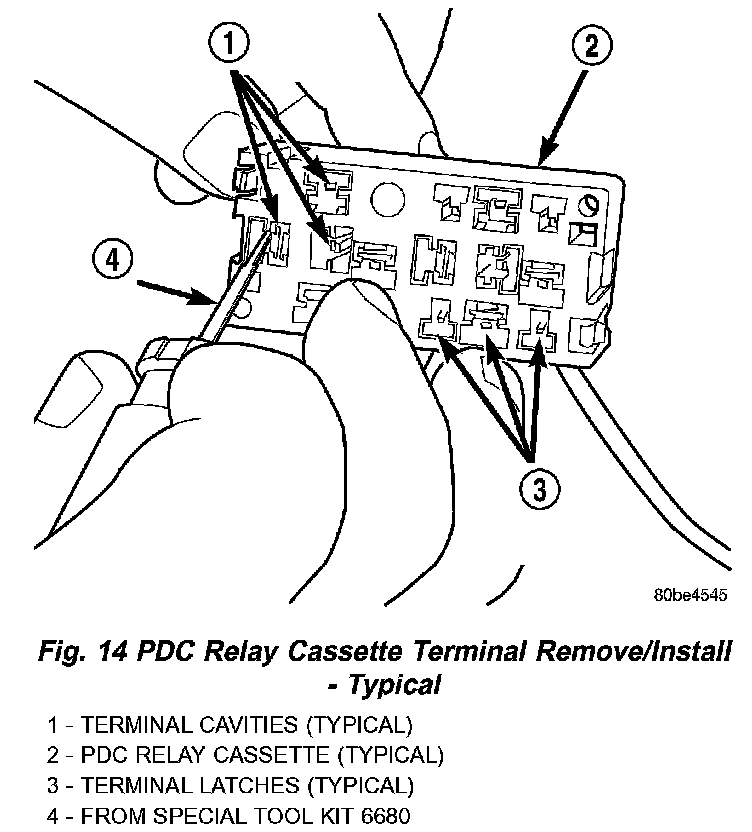 4. While pulling gently on the wire from the bottom of the faulty PDC relay cassette, use a terminal pick tool (Special Tool Kit 6680) from the top of the relay cassette to release the latch that secures the terminal in the relay cassette terminal cavity (Fig. 14).