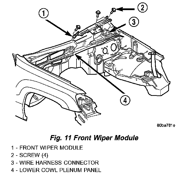- Motor - The front wiper motor is secured with three screws to the motor mounting plate near the center of the wiper module bracket. The wiper motor output shaft passes through a hole in the module bracket, where a nut secures the wiper motor crank arm to the motor output shaft. The two-speed permanent magnet wiper motor features an integral transmission, an internal park switch, and an internal automatic resetting circuit breaker.