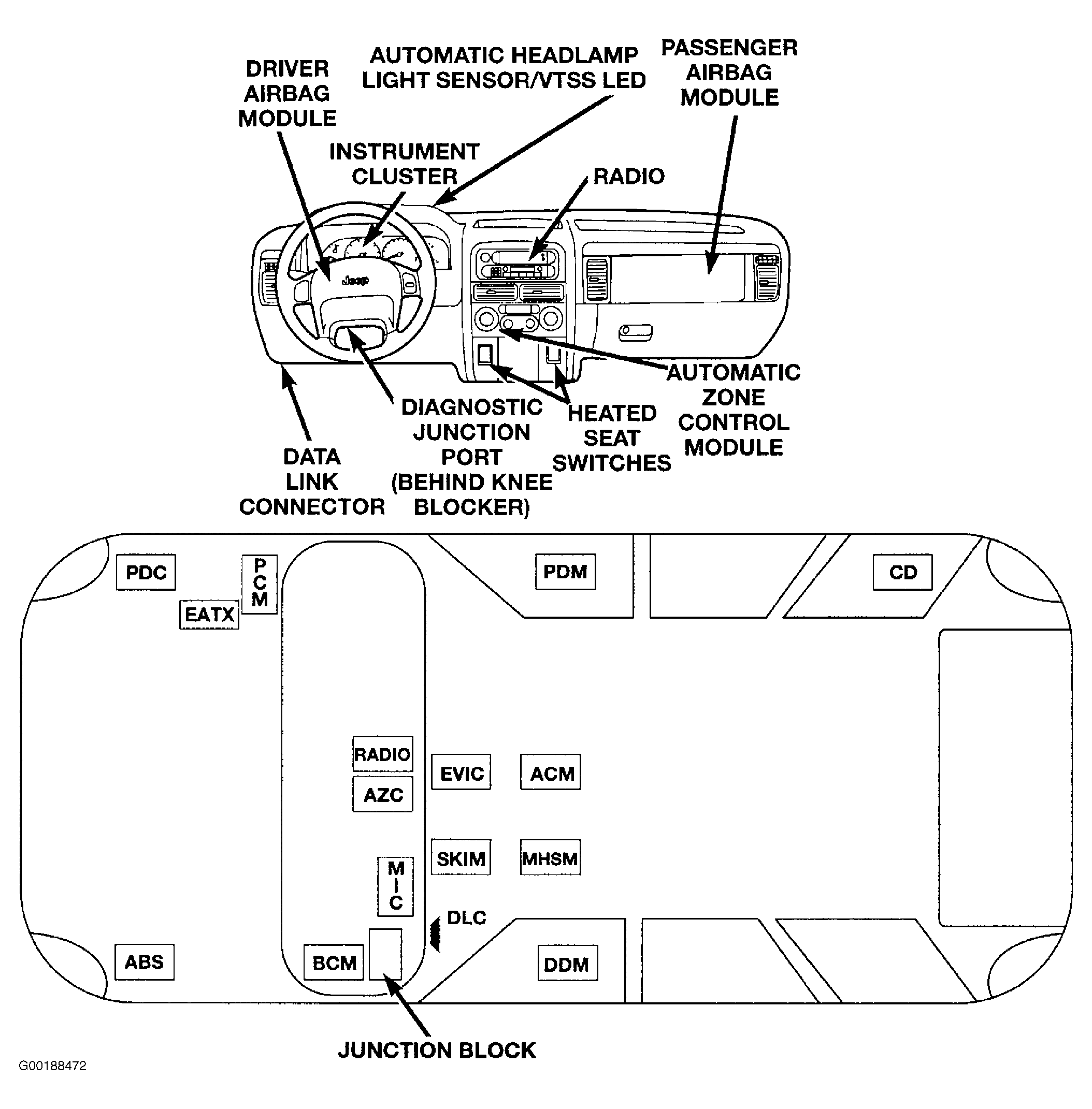 The Body Control Module (BCM) supplies vehicle occupants with visual and audible information and controls various vehicle functions. To provide and receive information, the module is interfaced to the vehicle's serial bus communication network (Programmable Communication Interface or PCI bus). This network consists of the Powertrain Control Module (PCM) or Engine Control Module (ECM) (diesel), the Memory/Heated Seat Module (MHSM, MSM or HSM), the Sentry Key Immobilizer Module (SKIM), the Transmission Control Module (TCM), the Electro/Mechanical Instrument Cluster (MIC), the Driver Door Module (DDM), the Passenger Door Module (PDM), the Airbag Control Module (ACM), the Controller Antilock Brake (CAB), the optional Electronic Vehicle Information Center (EVIC), the optional PCI radio, the optional CD changer, the optional Automatic Zone Control (AZC) module, the shifter assembly (diesel only), the optional power amplifier, the optional adjustable pedal module, the optional rain sensor, and the optional intrusion transceiver module (export only). The BCM is operational when battery power is supplied to the module. In addition, ignition switch power is needed for ignition switched functions. The BCM provides the following features: