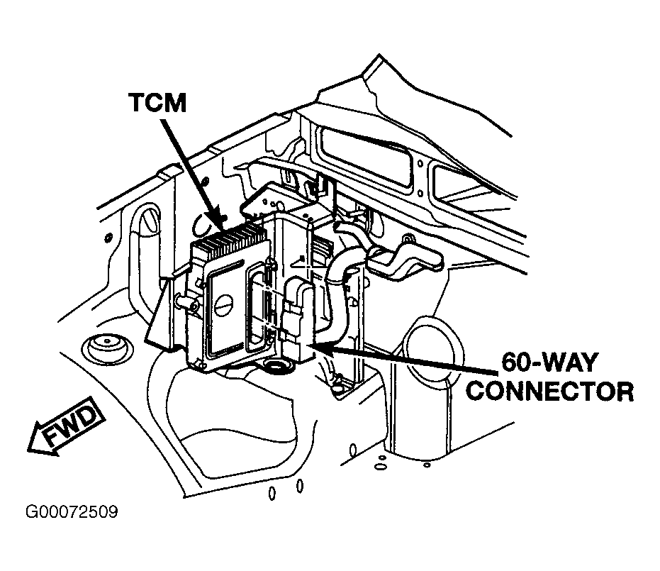 Transmission Control Module is located at right rear of engine compartment. See Fig 1 . Turn ignition off and disconnect negative battery cable. Remove bolts attaching TCM to bracket. Disconnect electrical connectors. Remove TCM. To install, reverse removal procedure.