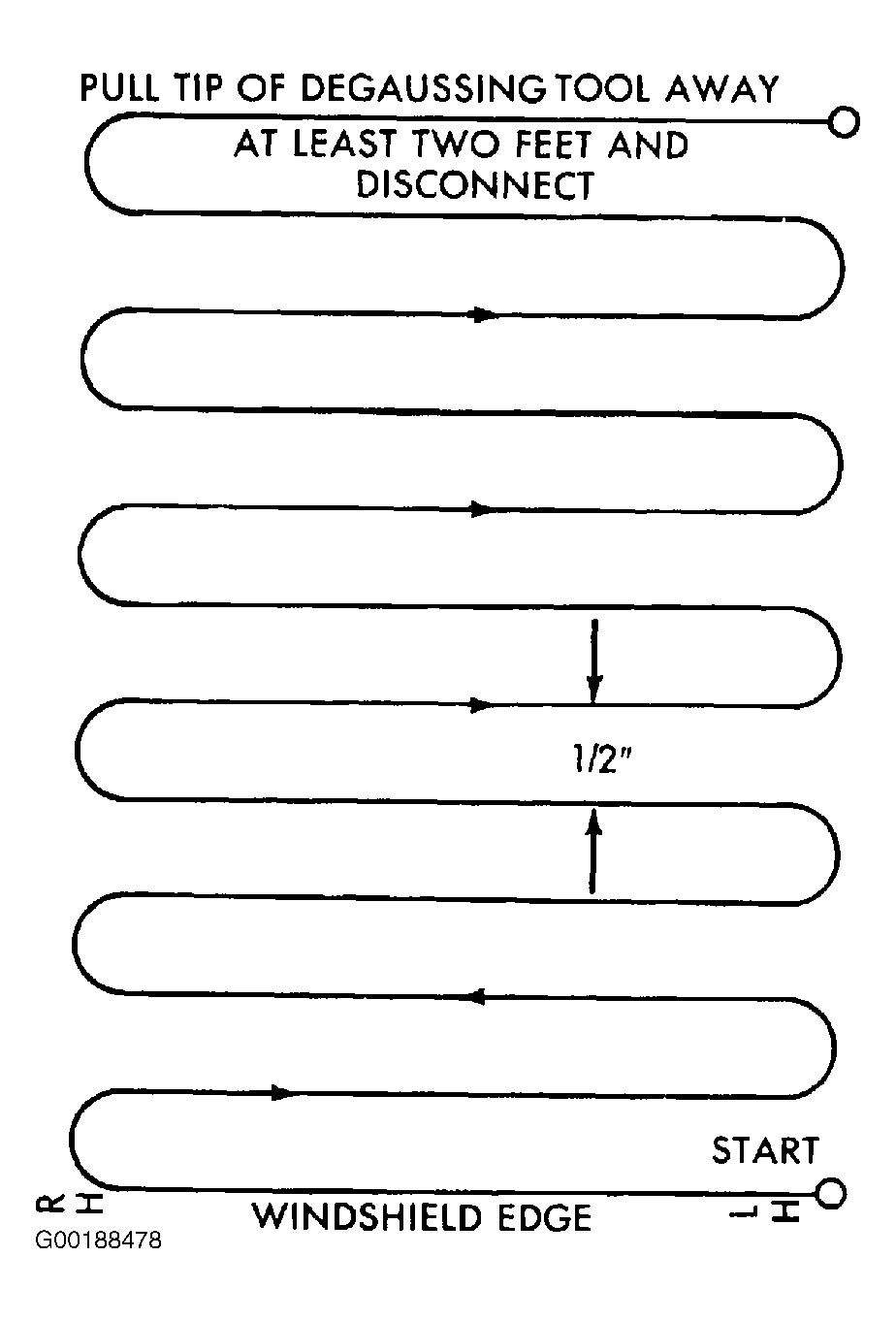 - Slowly approach the center line of the roof panel at the windshield header, with the degaussing tool connected.