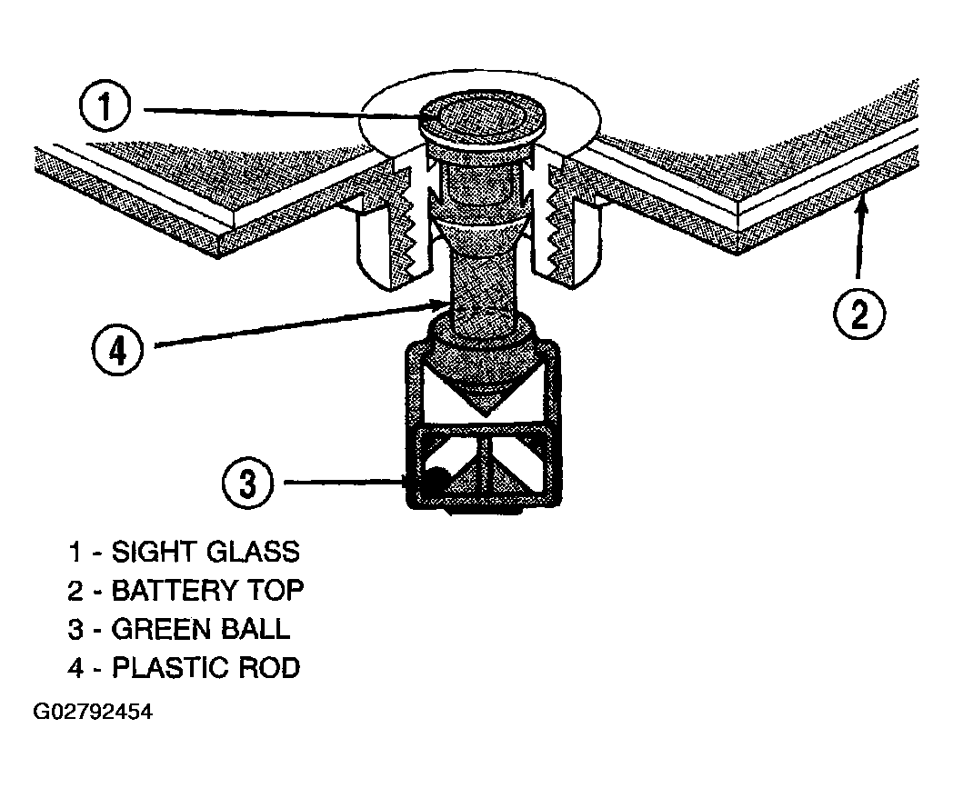 An indicator (hydrometer) built into the top of the battery case provides visual information for battery testing (Fig 1 ). Like a hydrometer, the built-in indicator measures the specific gravity of the battery electrolyte. The specific gravity of the electrolyte reveals the battery state-of-charge; however, it will not reveal the cranking capacity of the battery. A load test must be performed to determine the battery cranking capacity. Refer to STANDARD PROCEDURES for the proper battery load test procedures.
